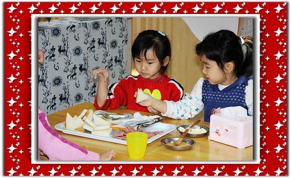 12月22日上午9点美食节活动正式开始,每个班设置了两种不同的美食专区。麻花、冰糖葫芦、小点心、面包、汉堡、汤圆、三明治、水果沙拉……各种简单易致的小食品让孩子们忙里忙外,喜不自胜。大小孩子们手拉手在不同的班级来回穿梭,自己动手丰衣足食,还是自己烹制的食品好吃!