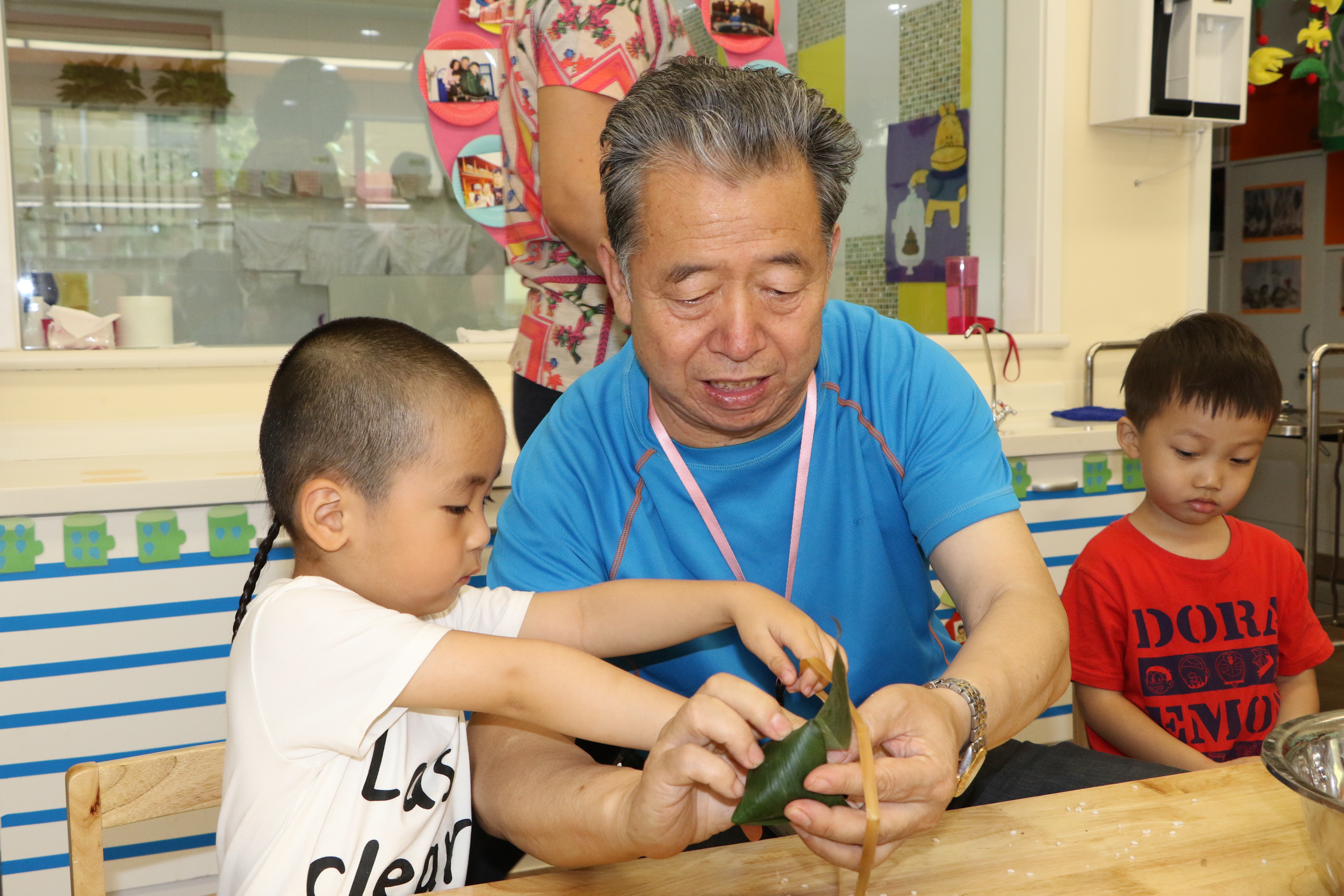 粽子很好吃,但是好包吗?通过家长们的演示,小朋友们很快就学会了包粽子的秘诀:认真看,细心学。一手拿粽叶,一手抓糯米。缠缠裹裹,慢慢来。米不丢,也不漏,小绳最后来固定。