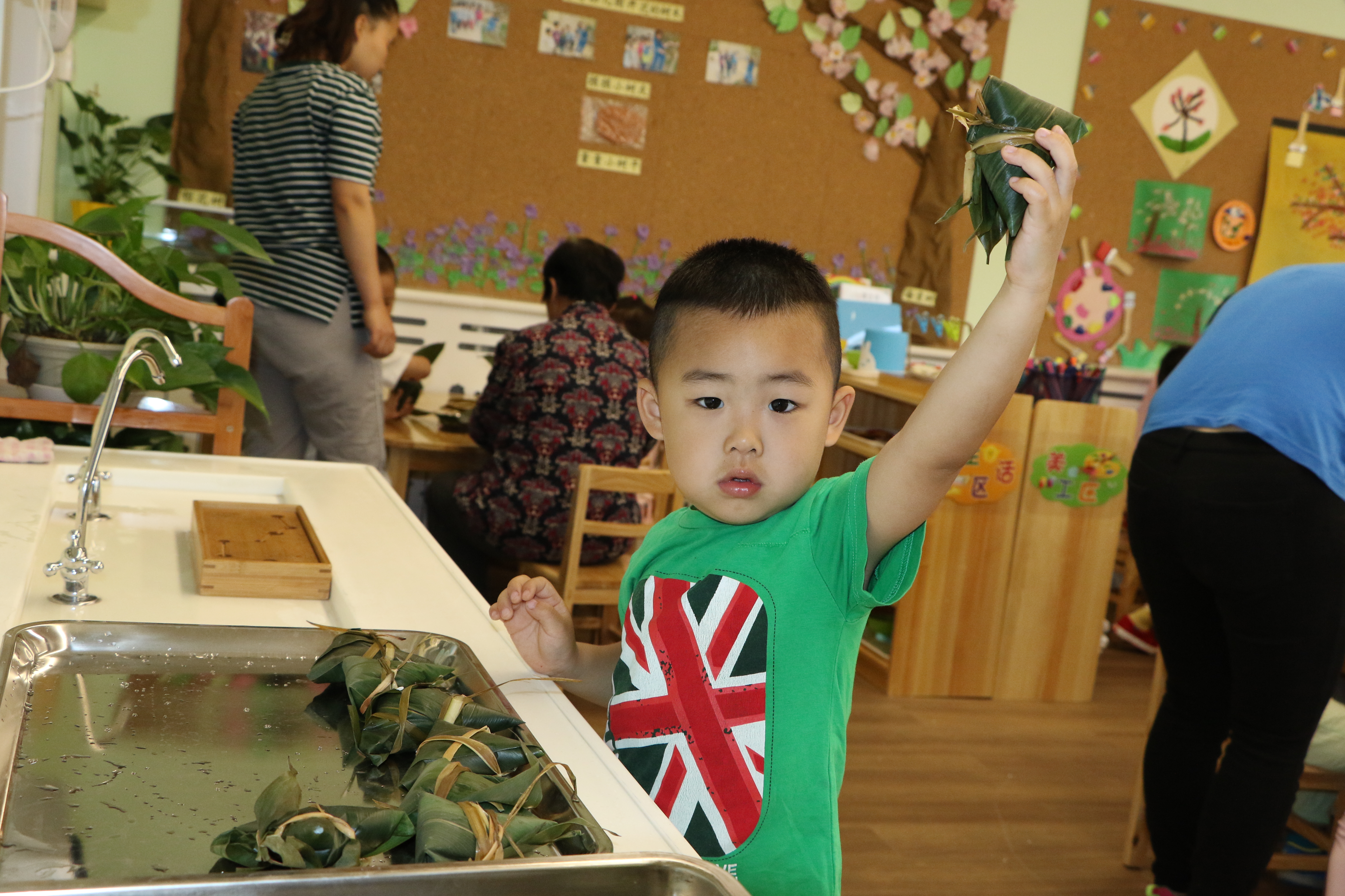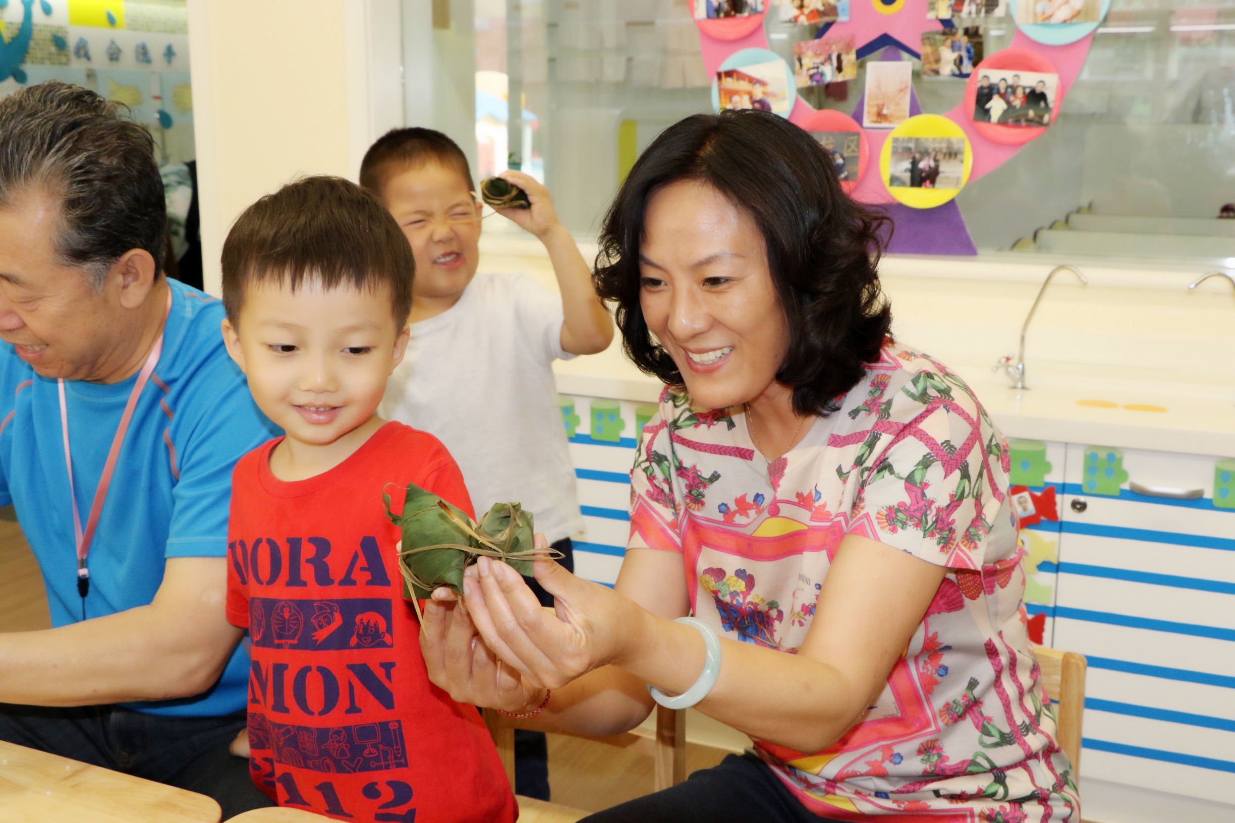 瞧,家长们教的多细心,孩子们学得多认真,一个个小粽子也像模像样。孙园长也来参加小朋友们的活动,小朋友和孙园长一起包粽子,一起比粽子,一起感受劳动的快乐。