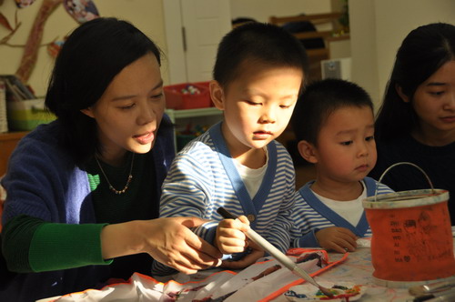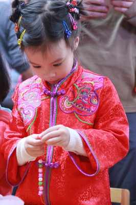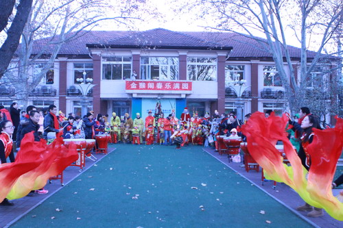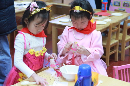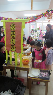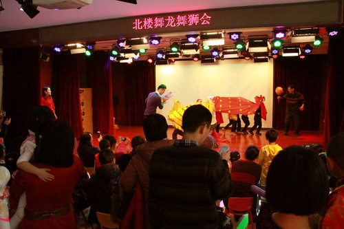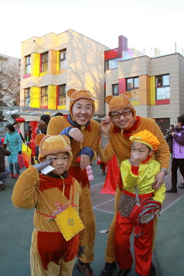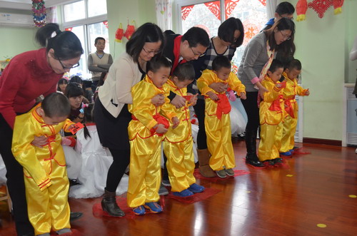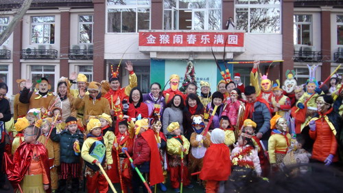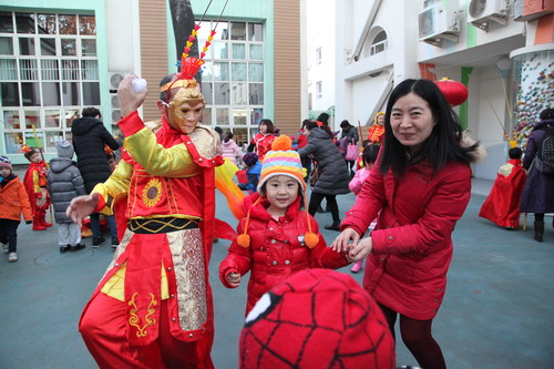 在10对亲子锣鼓队的阵阵锣鼓声中,在8名教师跟随鼓点的翩翩扇舞之中,在44对亲子金猴表演队自由、创意、惟妙惟肖的表演当中联欢活动开始了。大家都被锣鼓喧天的阵势以及大、小金猴们精彩的表演吸引了,金猴们一边表演一边还送出由孩子们亲手制作的手链、福字、香包、挂饰等各种礼物和祝福。