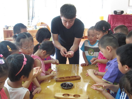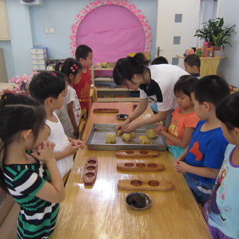 和老师,同伴一同制作月饼