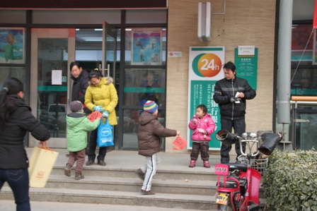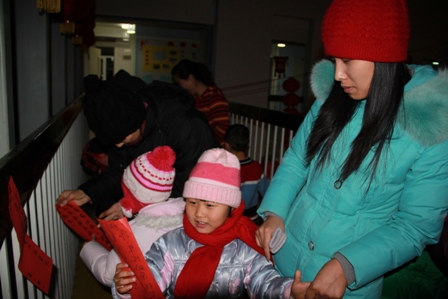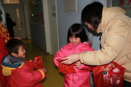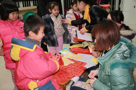 过年啦,写了“福”字送给小朋友、送给老师、送给爸爸妈妈、送给爷爷奶奶......还要送给谁?走出幼儿园,走进小区,来到大街上,见到陌生的叔叔阿姨、爷爷奶奶,亲切地说一声:“新年好!把福送到您家!”