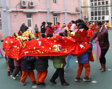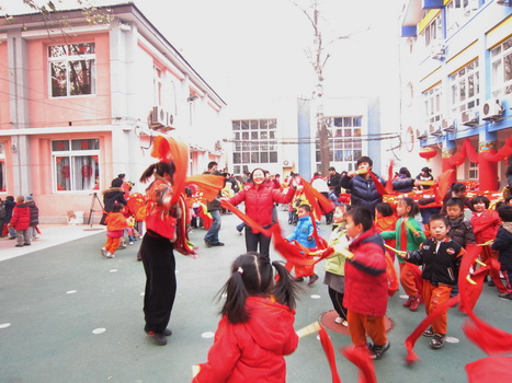 12月28日下午,幼儿园操场上锣鼓喧天、喜气洋洋,全托班师生一年一度的舞龙舞狮扭秧歌活动开始了。孩子们踏着欢快的鼓点,尽情地扭起秧歌,红红的绸子漫天飞舞,舞龙舞狮的孩子们更是配合默契,生动活泼地表现出长龙与金狮的动作特点,为节日的幼儿园更添几分喜庆与热闹。