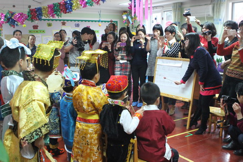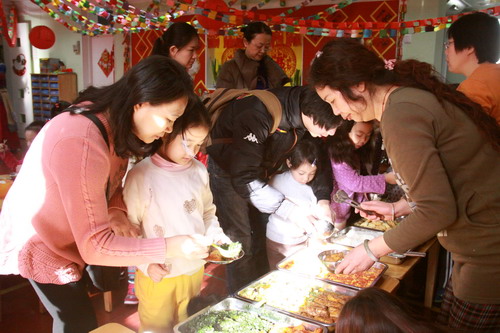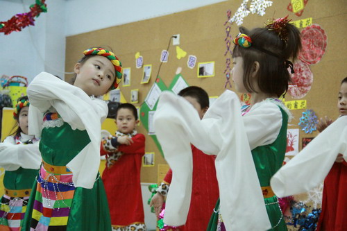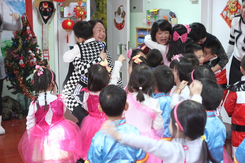 随后各班组织了丰富多彩的新年联欢会,活动中幼儿表演、亲子表演、教师表演、亲子游艺穿插进行,幼儿园领导在“奇奇”“妙妙”的陪同下到各班拜年,送上暖暖、浓浓的新年祝福,送上心仪、好玩的新年礼物。除此之外,全托部还举办了“新年民族庙会”,八个全托班变成了幼儿体验不同民族的民俗、品尝不同民族的美食的场所,民族风情浓厚,深受家长和幼儿喜欢。