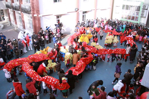 快乐的氛围也在户外不断延伸,红绸甩起来,秧歌跳起来、舞龙舞狮耍起来,由家长和幼儿共同参与的舞龙队、舞狮队、秧歌队欢聚一堂,大家用传统而又喜庆的方式迎接2015年的到来……