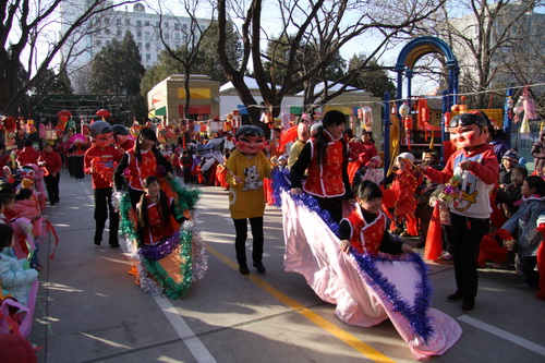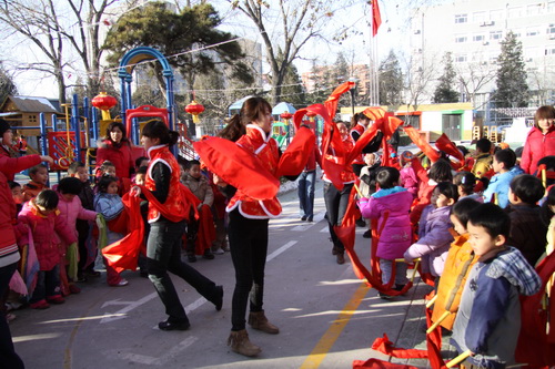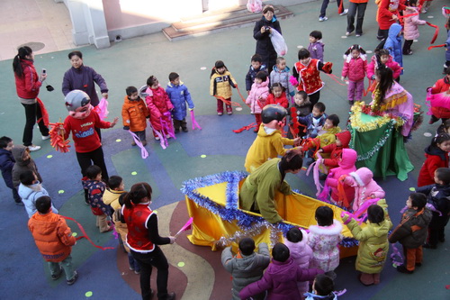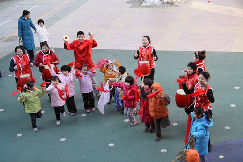 按照习俗,大年初一人们会走上街头逛庙会看秧歌,是“扭一扭”的日子。1月15日,正赶上农历的腊月初一,孩子们来到幼儿园的院子里,观看了由老师们自编自演的扭秧歌、跑旱船、扇子舞等活动,现场热烈的气氛极大地调动了孩子们参与的积极性。伴着欢快的鼓点,孩子们也兴致勃勃地挥舞起手中的红绸子,自然而然地融入到了“扭一扭”的队伍中,尽显生龙活虎的热闹场景!
