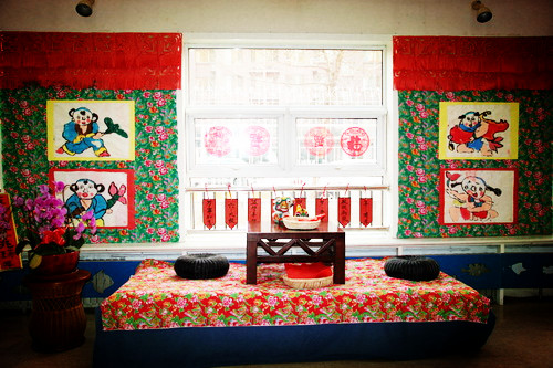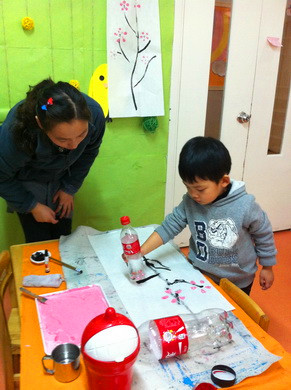 瞧,编中国结、扎丝巾花、印朵朵梅花;