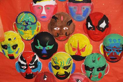 这是在观察京剧脸谱,然后亲自动手描脸谱呢