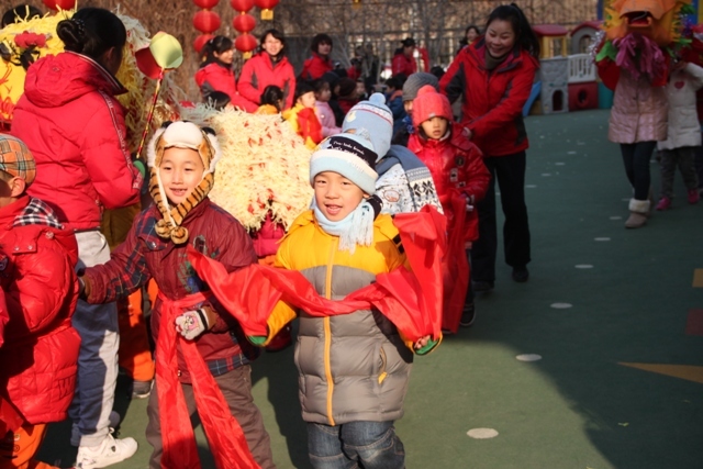 看完了舞狮表演,大班的孩子们按捺不住喜悦的心情,都跃跃欲试,想要亲自参与舞龙舞狮活动。在老师的引导下,他们高高举起双臂,五条金龙伴着《欢乐中国年》的喜气音乐上下、左右翻滚。一旁的婴小中班的小朋友更是甩起了红绸,扭起了秧歌,孩子们完全沉浸在欢乐之中。