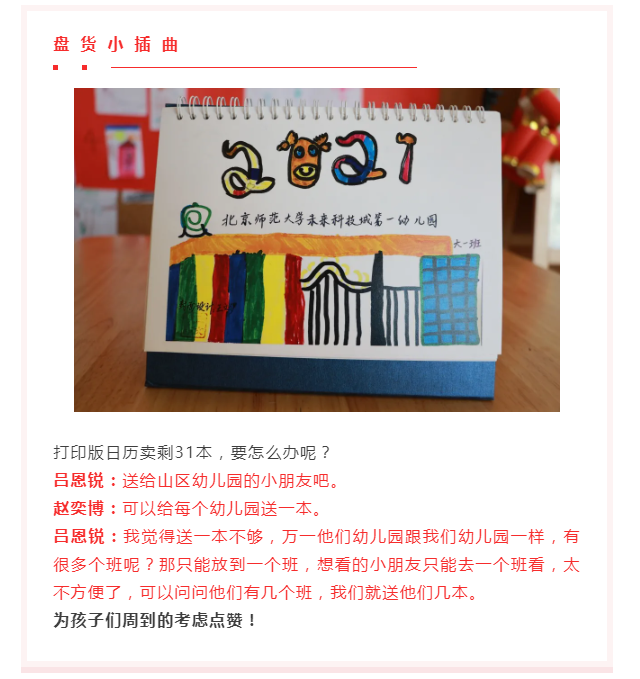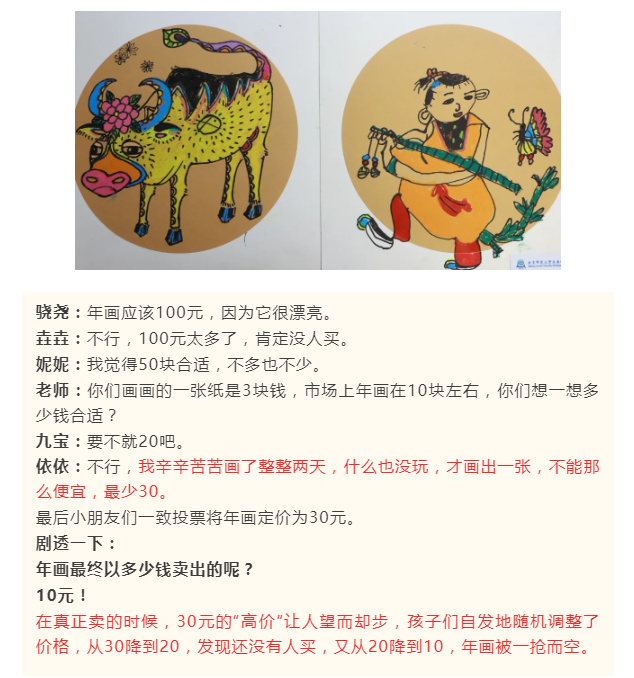 开始备货啦!剪窗花、绘年画、编拉花、折虎帽、粘鞭炮、写福字、烤陶土、制年历、做标本……整个12月,孩子们忙忙碌碌,准备赶集要卖的货物,还提前做过调查,每个班准备的都不一样哦。