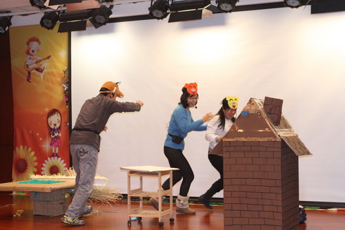 经过家长们前期报名、选剧本、分角色、制作道具、彩排等一系列的紧锣密鼓地筹备,2012年12月14日,“宝宝故事剧场”的首场演出——“宝宝迎新剧场”如期开始了,家长们表演了《小熊请客》、《三只小猪》、《拔萝卜》、《小蝌蚪找妈妈》等经典故事,精彩的表演充分调动了孩子们的兴趣,孩子们的表情也跟随剧情变化而或喜或忧。最后,宝宝们还亲自为参与演出的热心家长们颁发奖状,感谢他们的创意与付出!