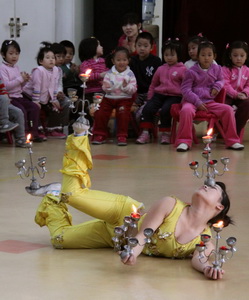 顶着烛台还能表演这么高难度的动作,真是太了不起了!