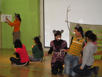 这是日托部主任邱老师正在讲《警察巴可尔和警犬葛芮雅》