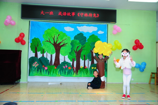大一班表演的是成语故事《对牛弹琴》和《守株待兔》