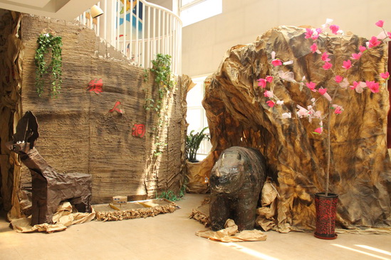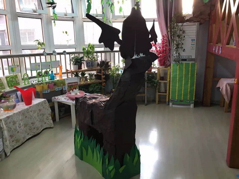 为了发挥幼儿在环境创设中的主体作用,每一次的大厅环境创设中九游都鼓励幼儿一起参与,把幼儿在创设环境过程中遇到的问题当做是提升幼儿解决问题能力的“良机”。如在这次创设“山顶洞”环境中,九游和孩子一起将泥巴糊在了光滑的墙面上,结果第二天泥巴全部脱落了。看着一天的辛苦付之东流,孩子们都互相打气“别灰心,加油!”经过讨论,第二次九游在泥巴里加入了乳胶,可泥巴还是一如既往地掉;第三次九游一起询问了幼儿园的维修师傅李老师,李老师给九游讲解和演示了泥巴掉的原因,并建议九游将泥巴糊在草席上,将草席挂在墙面上。经过努力最后九游终于成功了!第二天一大早看着终于上墙了的泥巴,孩子们都特别地激动!