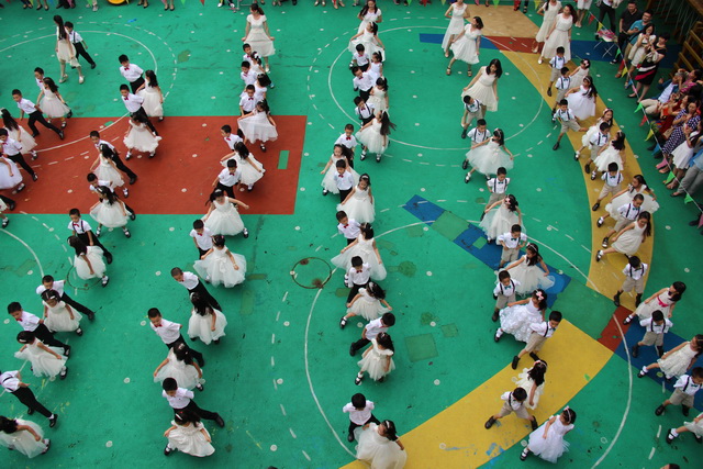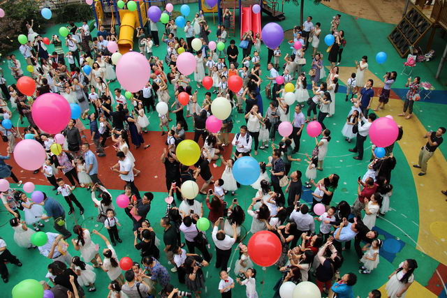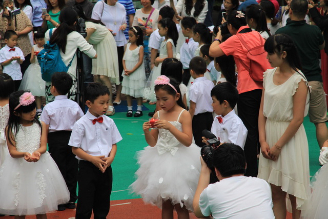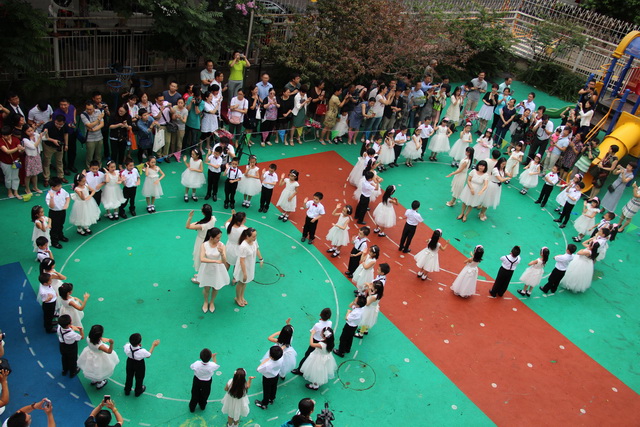 来到户外,全体大班孩子表演集体舞《男孩,女孩》