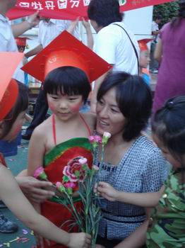 黄园长为与孩子们朝夕相处的老师送上一束鲜花,对她们表示感谢