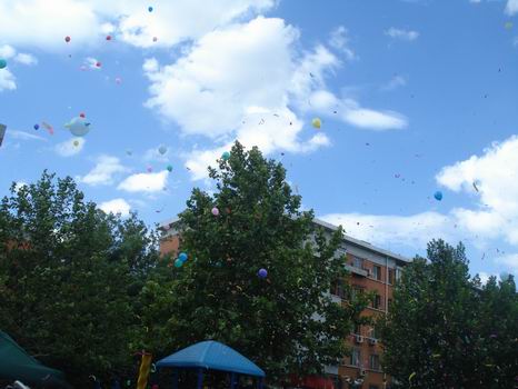 五彩的气球飘向湛蓝的天空,是否也会将孩子们的心愿告诉白云?