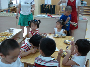 活动前的准备工作:老师们布置会场,孩子们在自制午餐。