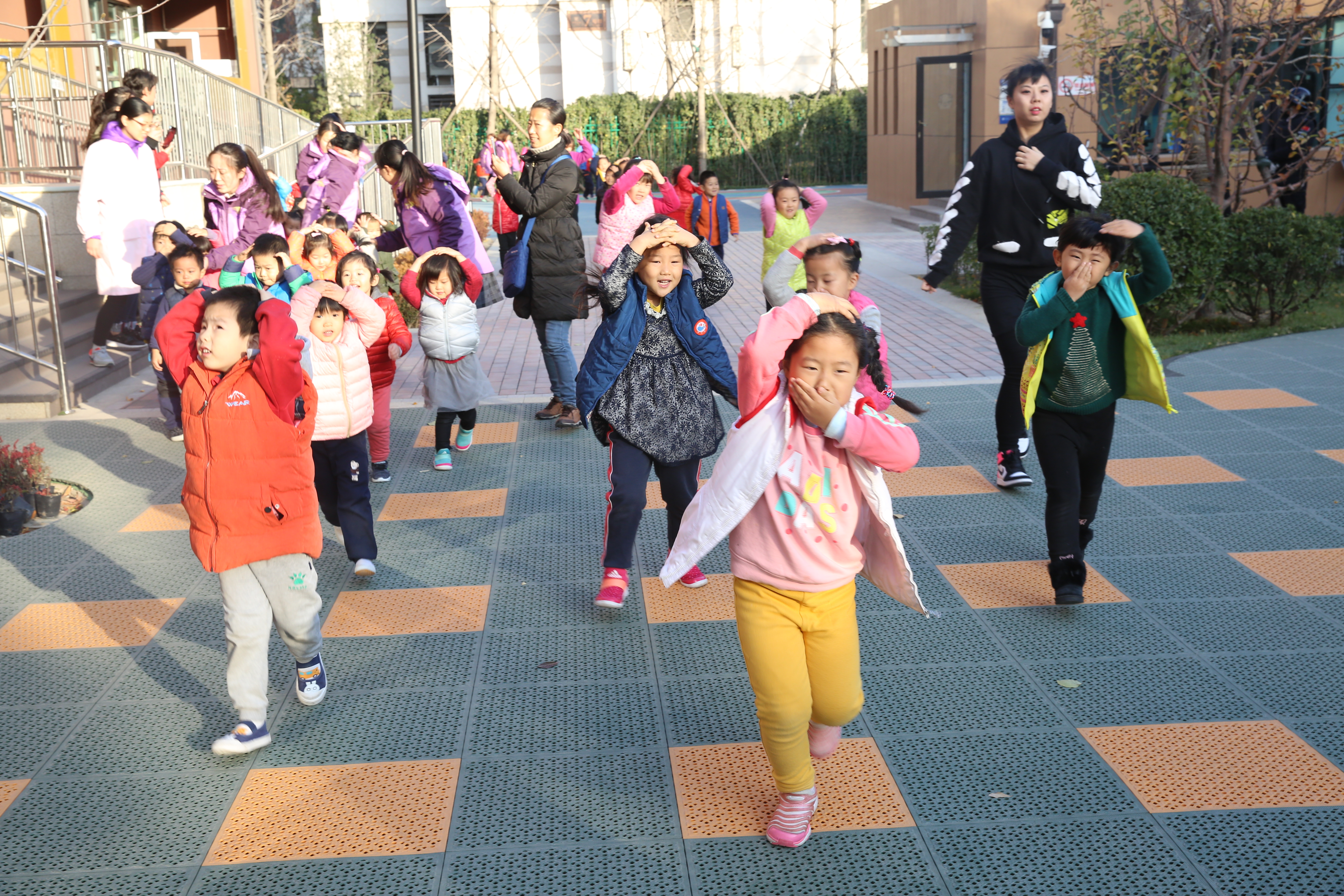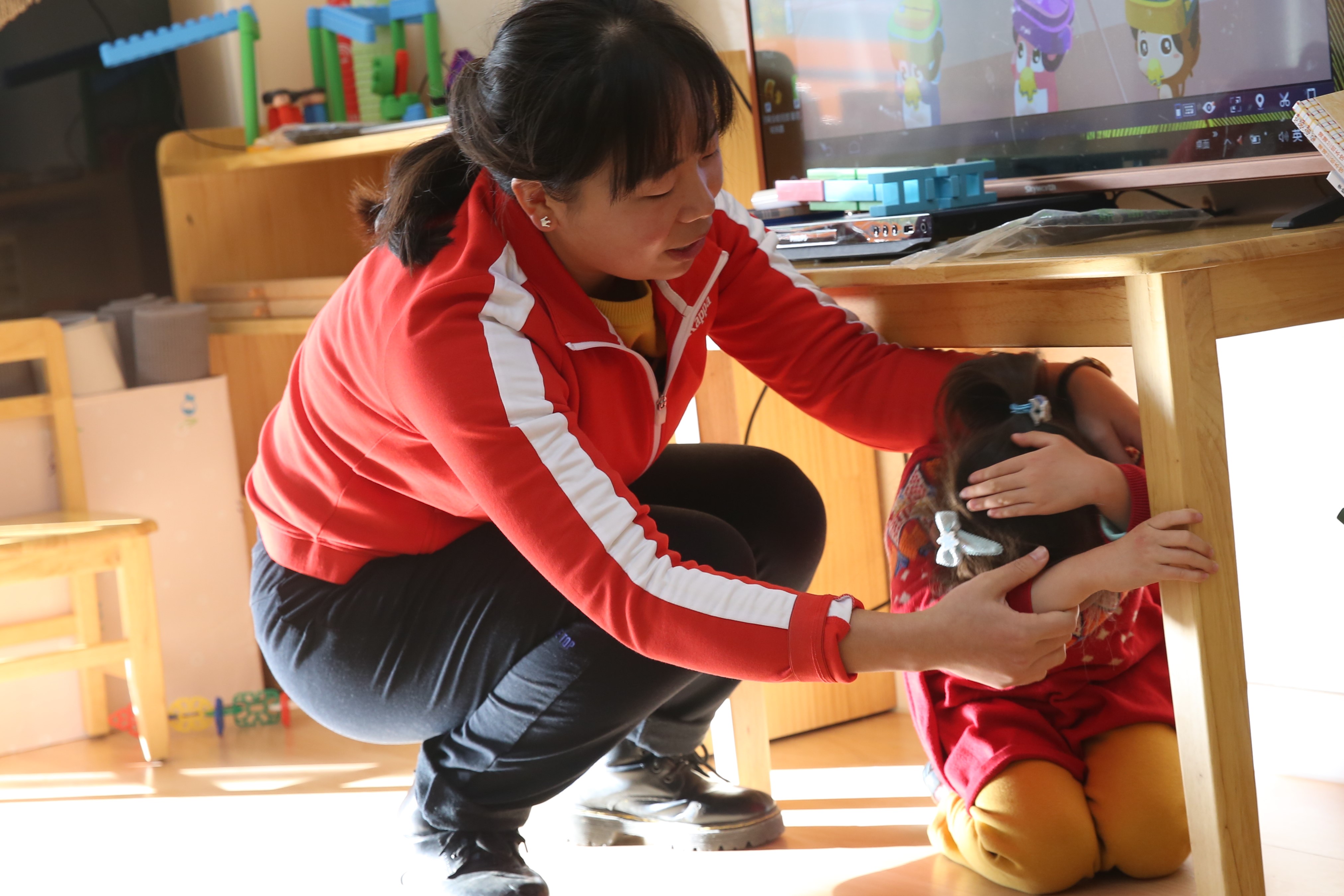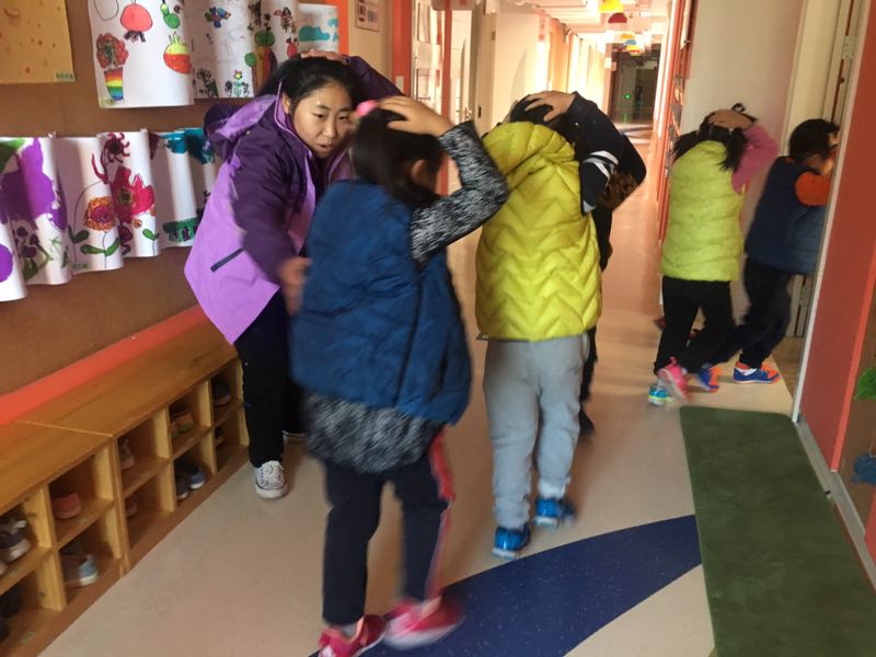 活动开始前,各班分别开展了安全教育,帮助幼儿感知地震发生时在室内避险的三个要点:蹲下、掩护、抓牢。幼儿在游戏互动中,初步了解了地震发生时紧急自救的正确方法。