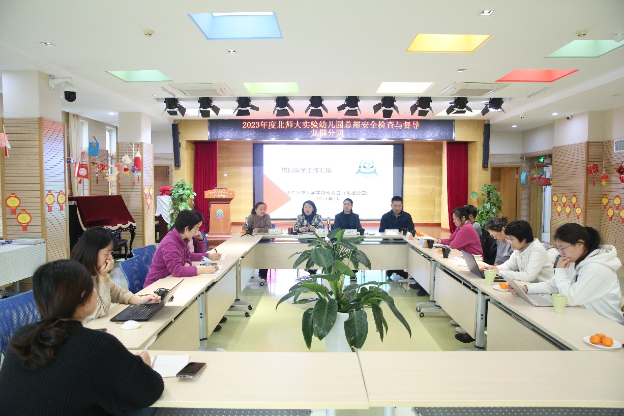 首先,黄珊总园长强调了本次安全大检查的重要意义,并对检查流程做了周密的部署。随后两位副园长就我园日常安全工作的落实情况与检查组的各位领导进行了深入交流,高度肯定了我园对安全工作的重视。之后,各位领导听取了龙樾分园执行园长高以华做2023年度安全工作汇报,高园长从制度建设、措施保障、安全教育及联防联治这几个方面全面介绍了龙樾分园各项安全工作的开展情况。进而,检查人员分三组分别从班级安全、消防安全、厨房安全、保卫安全、宿舍安全这几个方面实地查看了设施设备的使用情况、水电燃气和门窗的安全情况等,并就机房、垃圾处理站等几个重点场所进行了一一现场勘查,就各项安全档案进行了细致的查阅。
