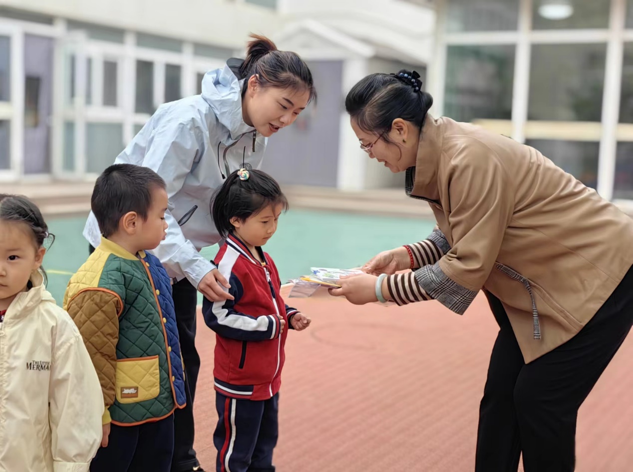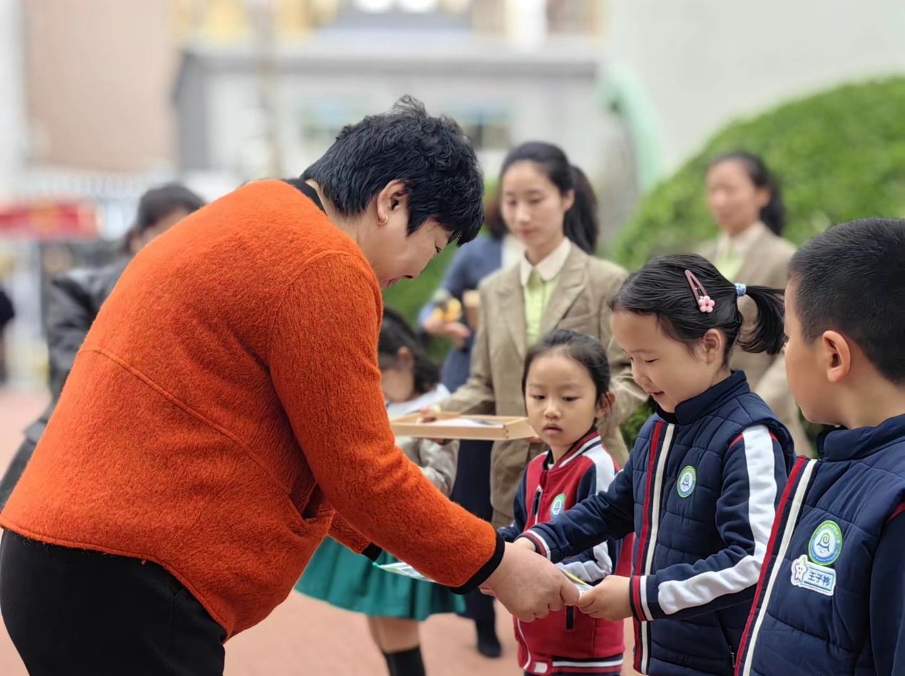 花园路街道副主任高艳红为幼儿颁发节水宣传卡