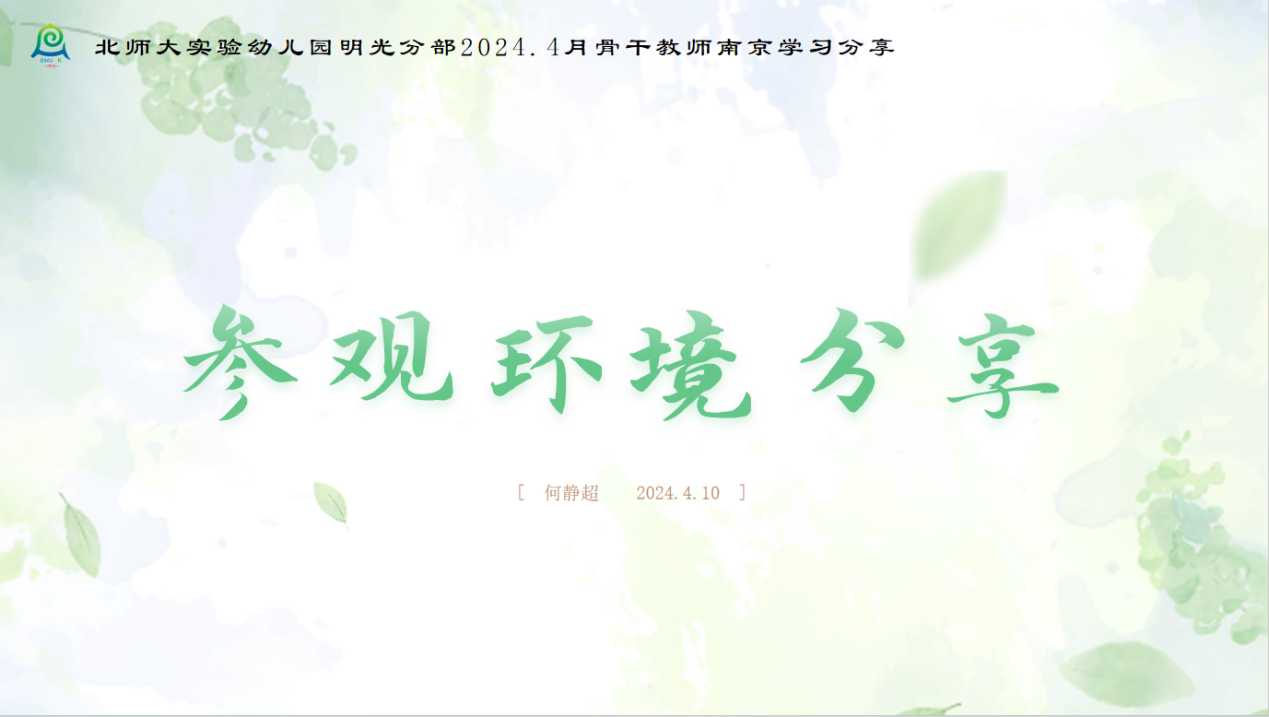 3月末,我园保教主任王晓晔、骨干教师彭倩、何静超跟随集团到南京进行了名园参观学习活动,从园所文化、课程开展、环境创设等多角度了解各园情况。4月10日,3位教师开展了南京学习的全面分享,并从整体学习感受、主题活动亮点分享、班级环境创设三个角度向大家进行了学习汇报。