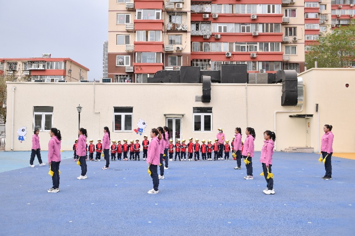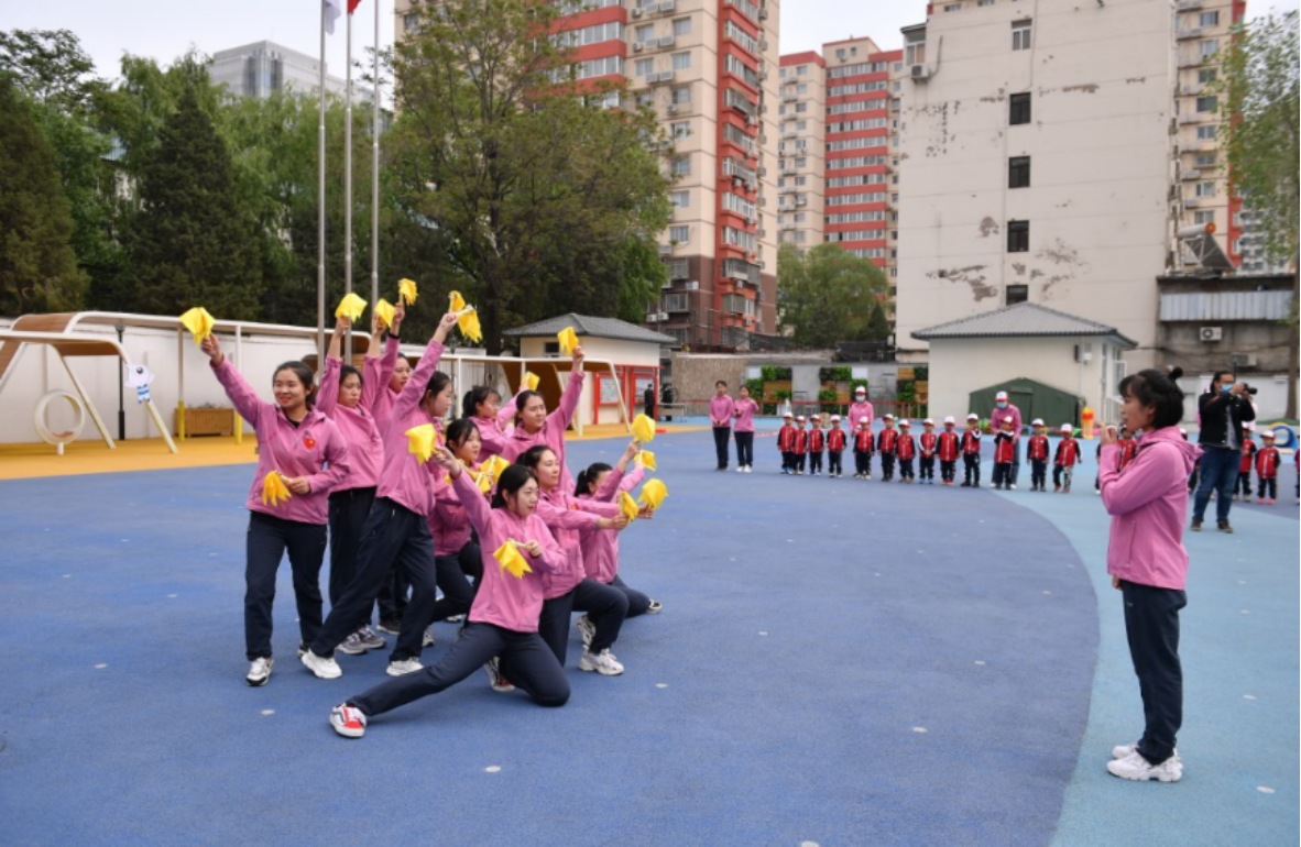 “立、正!”“1、2”响亮的口号声回荡在操场上。立正站好、挥舞花棒、变换队形、大步奔跑……老师们的表现真是太精彩了!