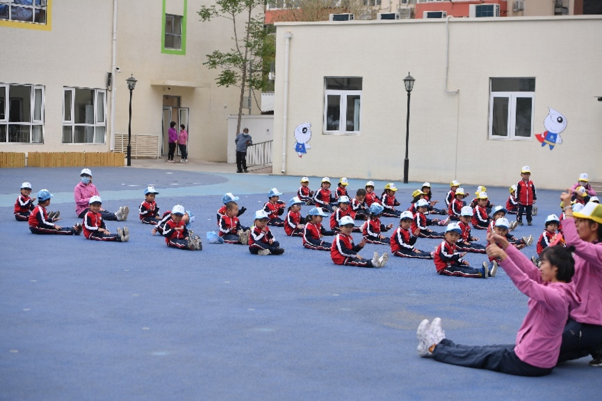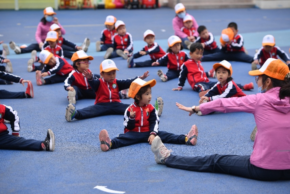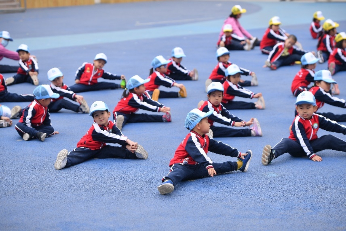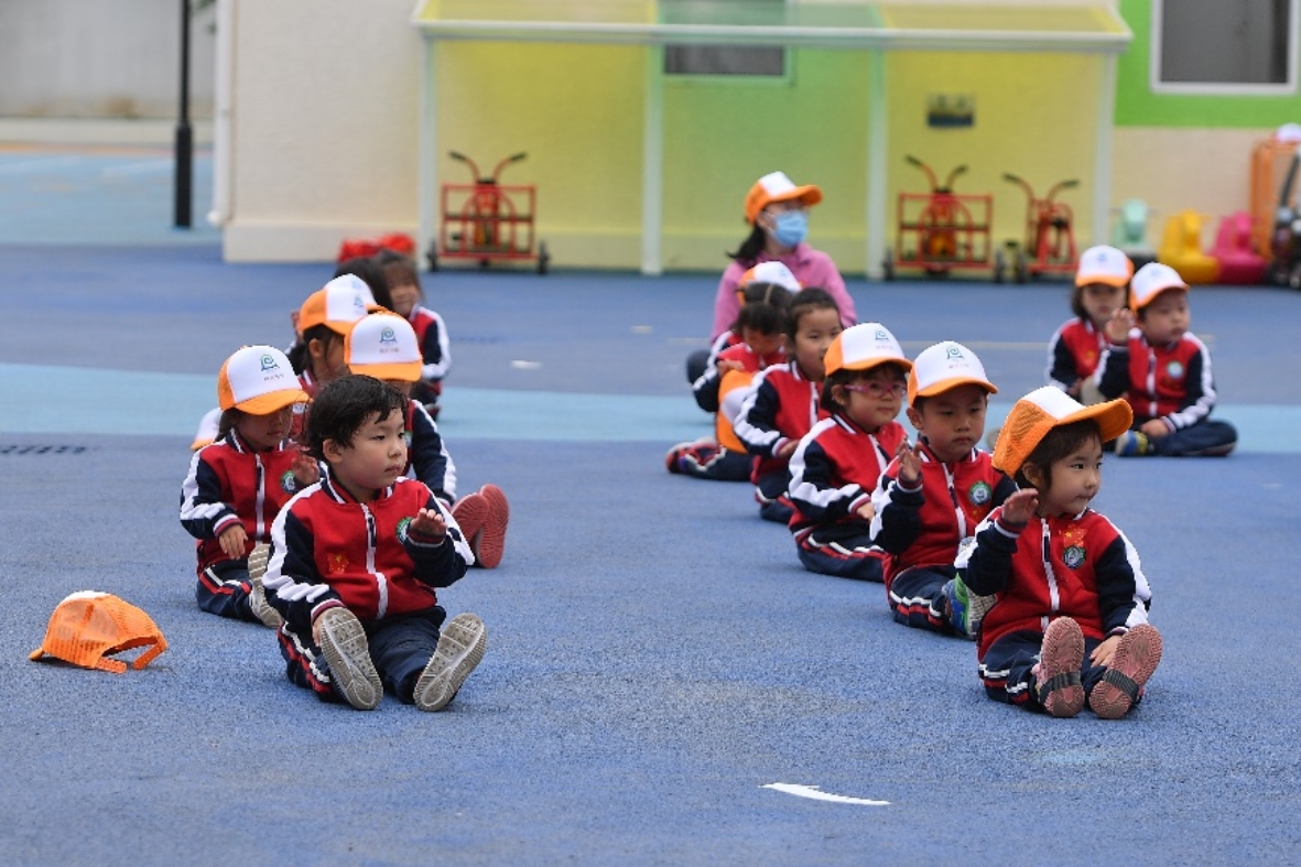 在轻缓的音乐中,小朋友们小脸红扑扑的,认真和姬老师做拉伸放松运动。