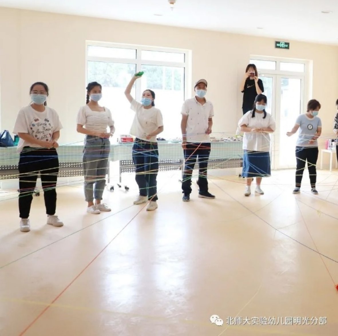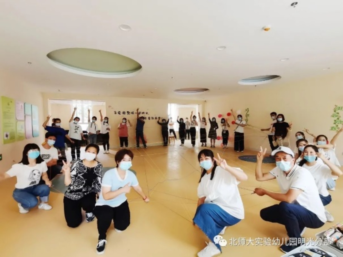 游戏是最好的教育方式,全体教师围成一圈转,用毛线做传递,用爱心织新篇,两点成线,点线成面,色彩交织,你我连接,无限美好,未来可期。这是《爱的传递》,是新团体的构建,让九游传承实幼文化,创造无限可能,明光未来必定色彩斑斓,风景无限。