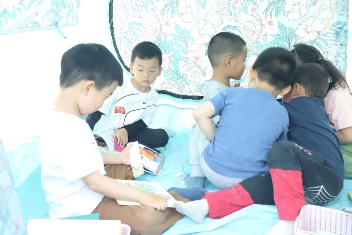 5月10日,天气晴朗,阳光正好,幼儿园开展了户外“阳光悦读”的活动。阳光暖暖的照着,和煦的微风拂过。8个故事,8个阅读空间,不同的讲述方式,孩子们在音乐的指引下参与活动,换场地聆听,徜徉在阳光下,徜徉在美妙的故事里。