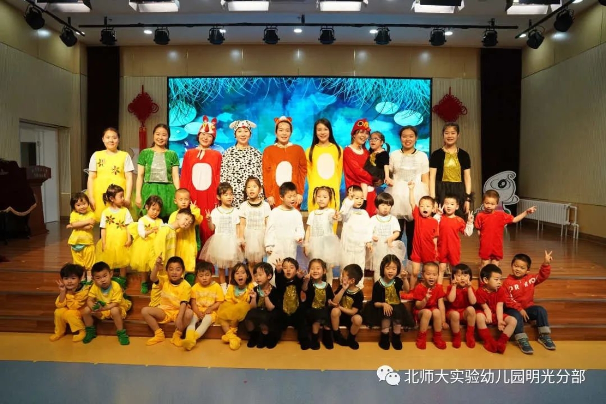 小三班的老师们变成了故事里的动物妈妈,带着全体小朋友一起表演了有趣的故事《小蝌蚪找妈妈》。