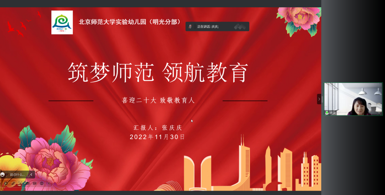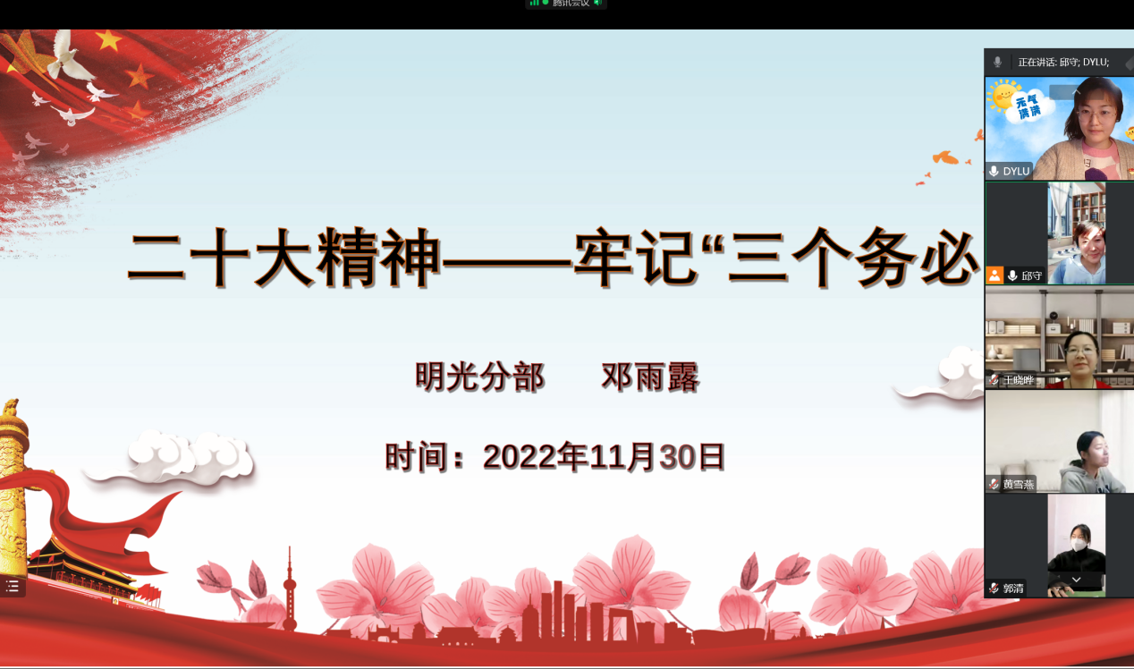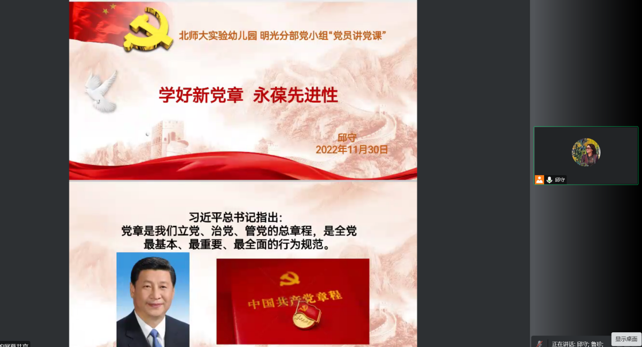 基于这样的背景,2022年11月30日九游体育实验幼儿园明光分部开展了线上党小组活动,本次活动由8名党员和1名预备党员参加,其中邱守、王晓晔、邓雨露、黄雪燕、张庆庆5位党员围绕党的二十大精神开展了党员讲党课的活动。大家的讲述的内容涵盖:《中国共产党章程(修正案)》通过的意义及其内容、中国式现代化引发的教育反思、“三个务必”的内容及其在新时代的重要性、党的二十大精神及中国式现代化、党的二十大对教育人的启示。