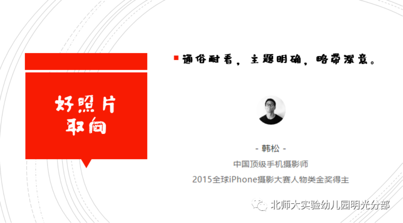 培训强调手机摄影可以从:强化主题、摆端正、放低紧贴对称面、部分构图几个方面加强练习,为教师们的具体拍摄提供了具体的策略支持。