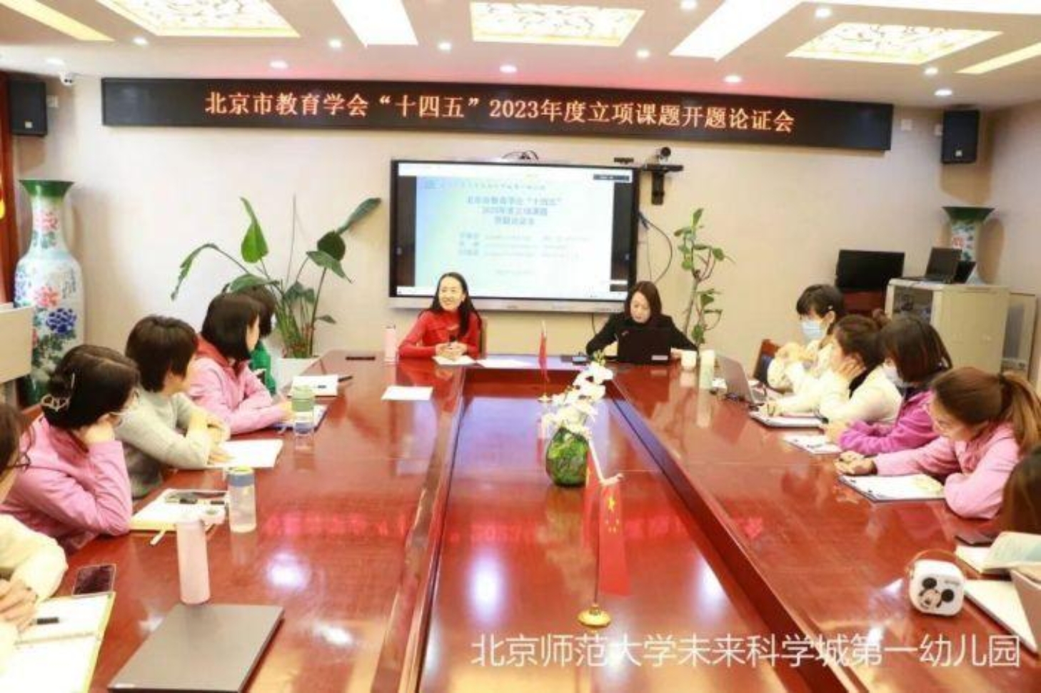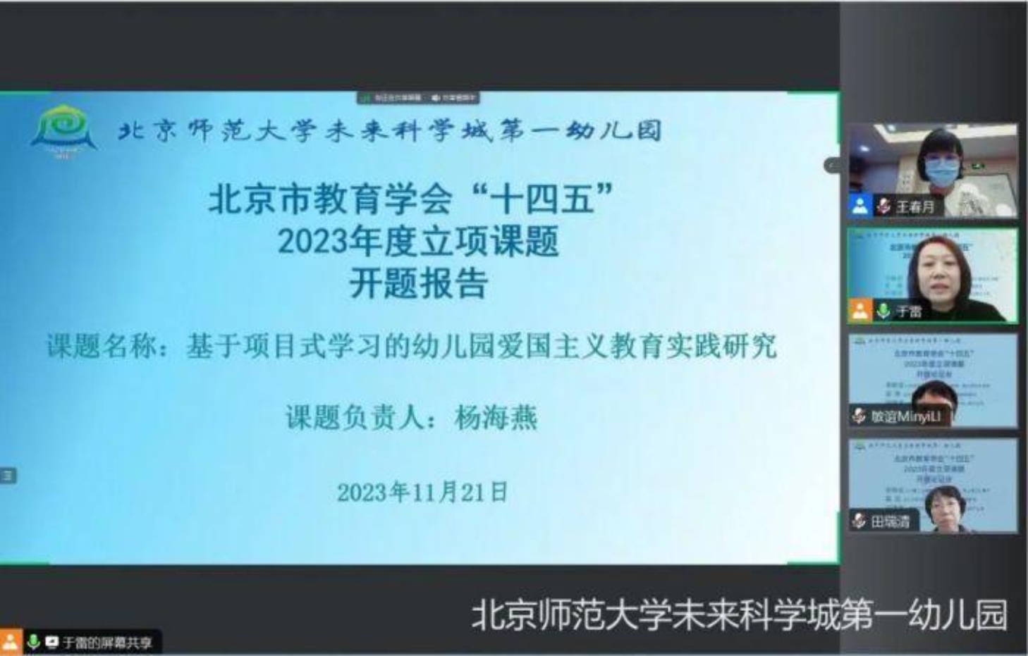 执行园长杨海燕作为课题负责人做了开题报告。报告中详细介绍了课题的选题依据,对“项目式学习”与“幼儿园爱国主义教育”进行了概念界定,并对幼儿园爱国主义教育和幼儿园项目式学习进行了文献综述与评析,同时对本课题的研究目标、内容、方法、思路、技术路线和研究预期成果等进行了详细阐述。