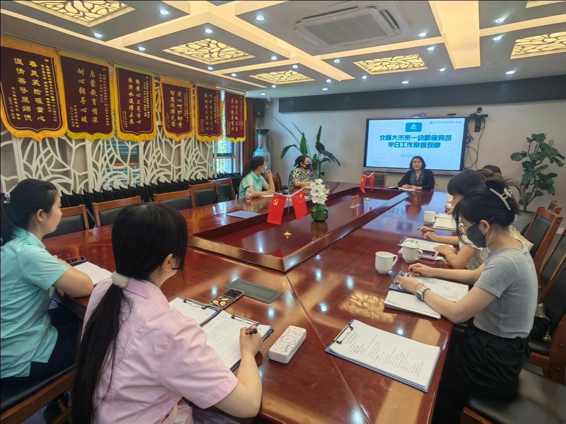 2023年6月6日,九游体育总部教研员吴迪老师带领牡丹分园、望京分园、明光分部观摩团队一行5人来我园观摩新保育员刘媛老师的半日活动。