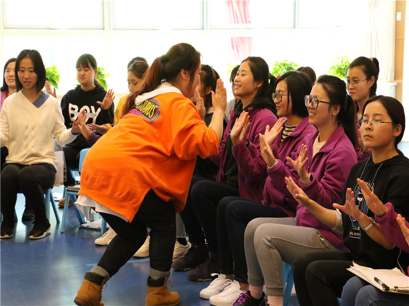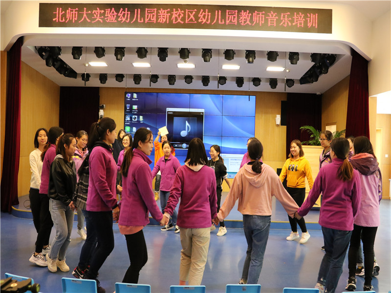 中午,吕老师首先从基本的音符、节奏、节拍、音感等方面为教师普及了不同年龄段幼儿适宜的音乐活动内容及常见的表演方式。其次,通过教师现场参与《调皮的小鼓》和《苹果丰收》两个活动,具体分析了音乐活动的教师组织策略及基本规范。教师在体验中学习着每一个环节的组织,切实领会着如何将音乐融入幼儿的游戏与活动之中。