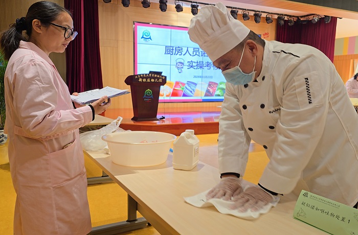 考核前,保健主任郭彩云强调了厨师发生呕吐腹泻情况需立即离岗,其他厨师要对呕吐物进行正确消毒,必须重视急性肠胃炎防控。