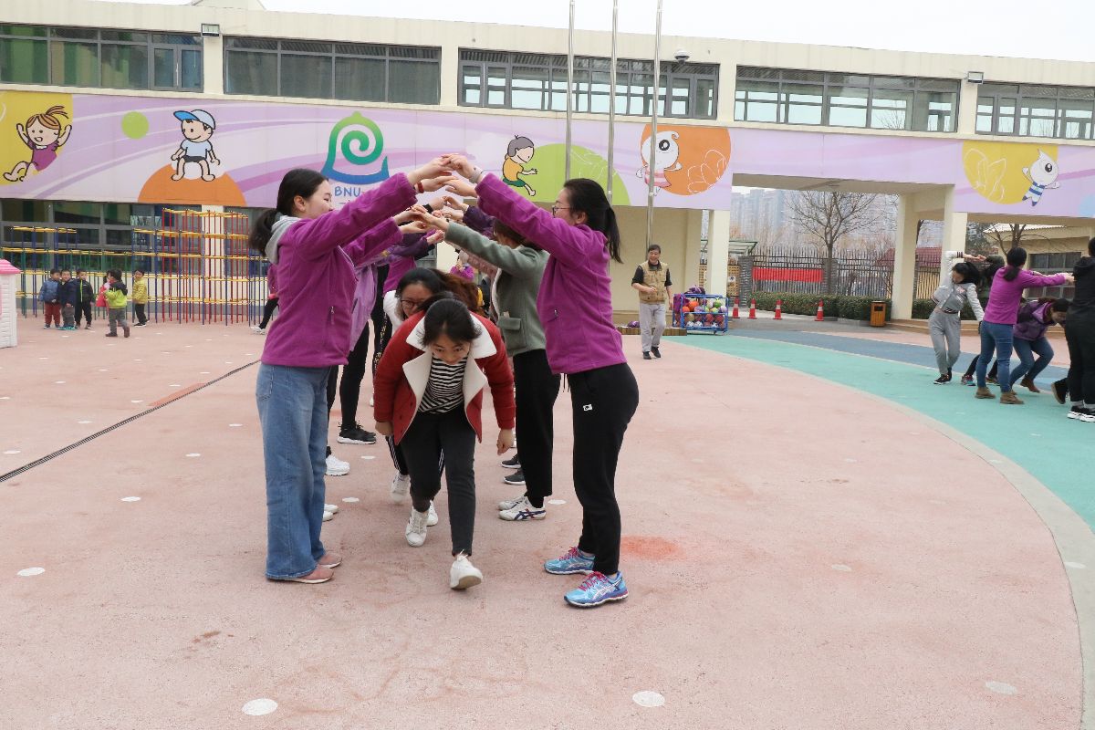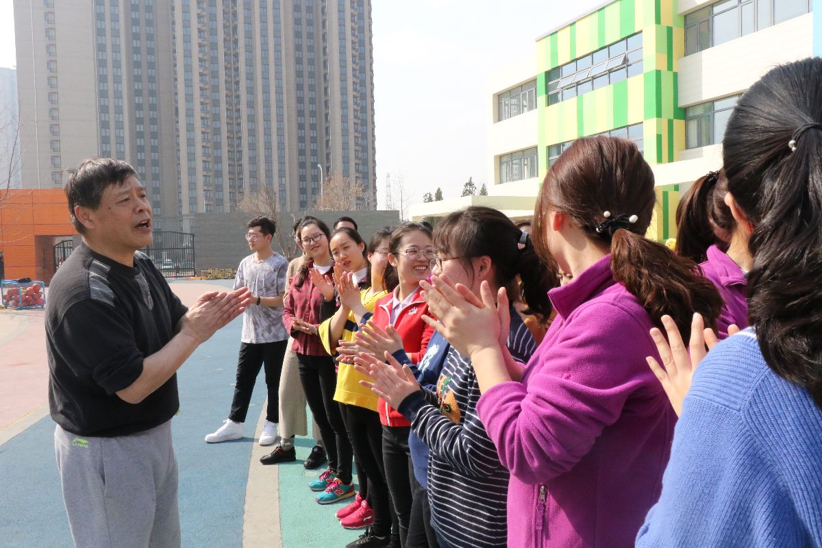 张老师组织教师进行体育游戏。