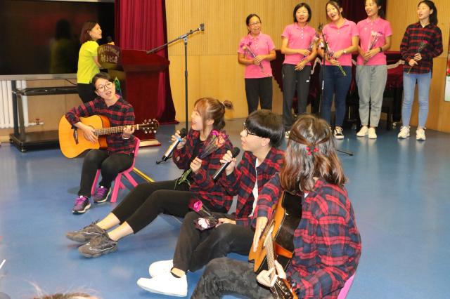 会后,刚毕业的小学生回到幼儿园为老师们庆祝节日,感谢老师们的精心呵护。