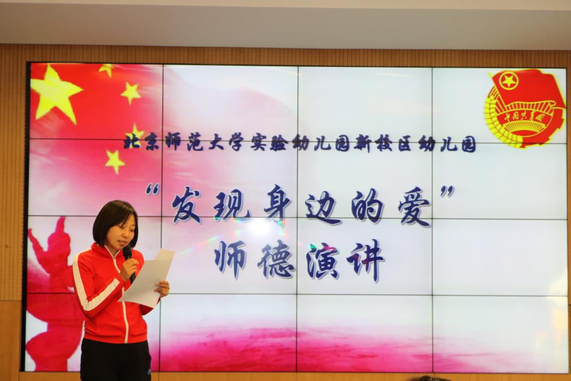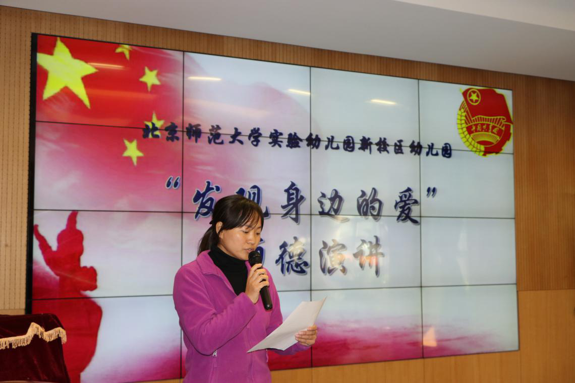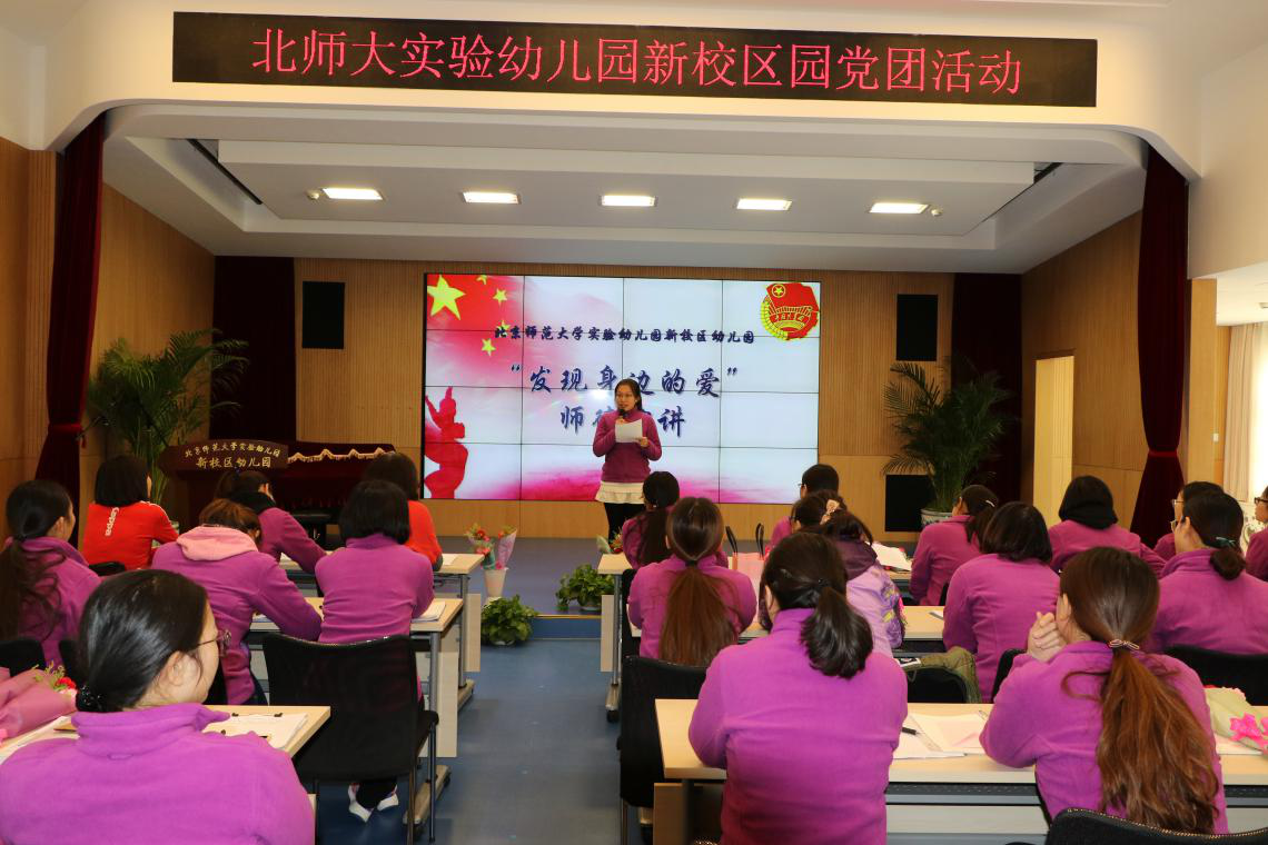 2017年11月21日,为了引导教师学会观察幼儿、理解幼儿,践行“以儿童为本”的教育理念,基于教育实践深刻理解和认识幼儿教师专业道德素养。新校区园组织教师开展“发现身边的爱”党团师德主题活动。活动之前面向全体教师以“发现身边的爱”为主题征文,请教师结合身边的例子,分享教师对待孩子的耐心、爱心如何在一日生活之中体现。活动中三名教师分别代表新教师、新班长、老教师演讲并分享感受,随后保教主任韩丹结合自身工作经验做了《没有问题幼儿,只有幼儿的问题》主题发言。最后,孙秀莲园长勉励全体教师观察幼儿、发现幼儿,做幼儿心目中的好老师,借助幼儿园搭建的平台多交流、多学习,共同为孩子的成长而不懈努力。