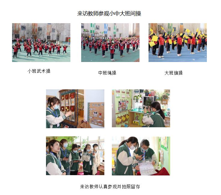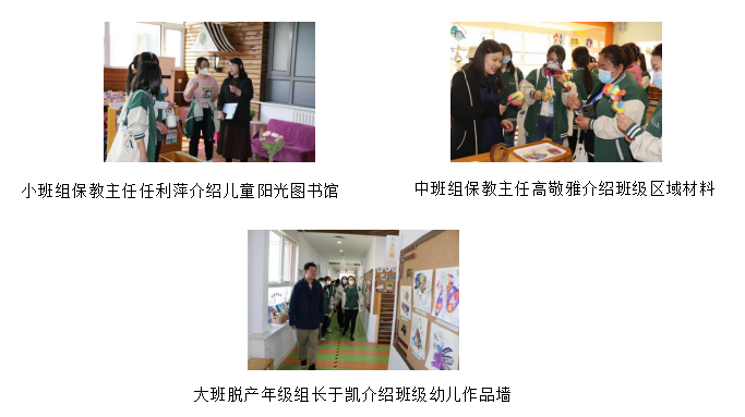 随后保教干部分组带队参观了我园公共环境、班级环境及户外活动,详细介绍了幼儿园环境创设的理念、主题活动开展情况及区域创设等内容。