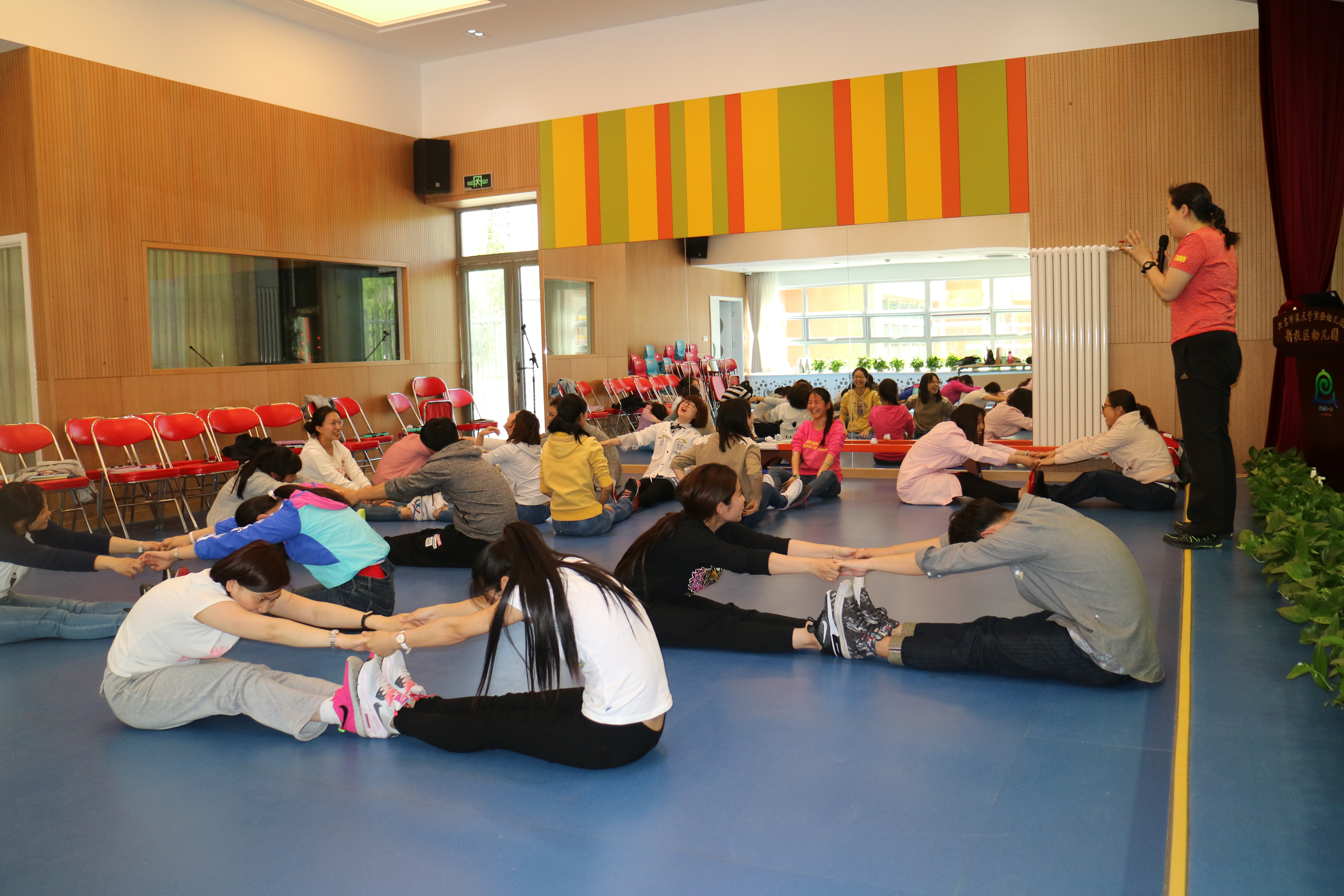 教师们现场演练,认真学习,为保障幼儿体质健康的有效锻炼做充足准备。