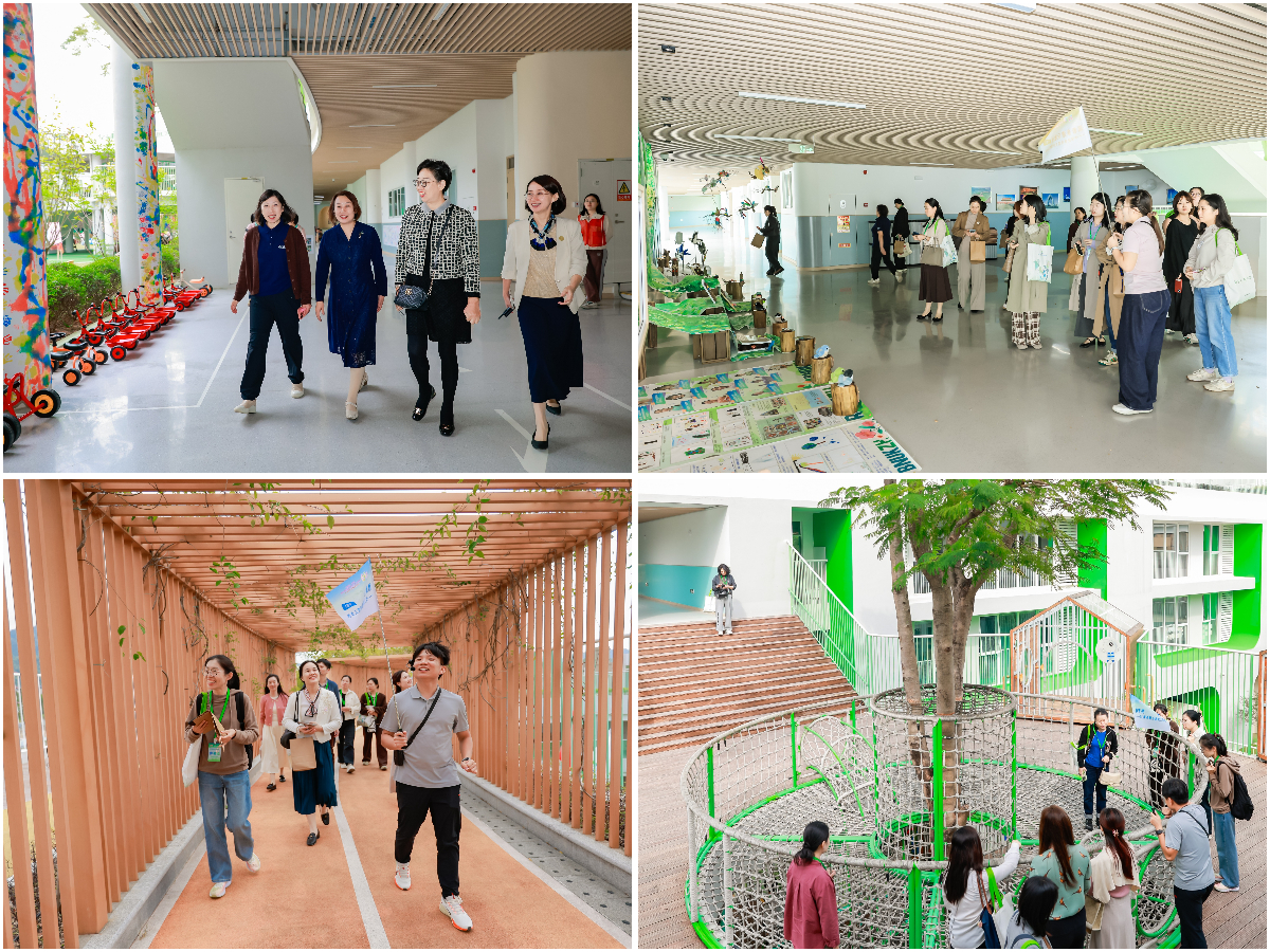 该工作坊由新校区园教科研主任田蕊敏主持。与会嘉宾漫步于景致宜人的空中花园,在“艺术长廊”“探险营”“花草探索角”三大游戏空间中自由探索,亲身体验儿童在游戏中的认知建构与情感表达,重新审视游戏与发展的内在联系。在随后的倾听与表征环节,教师们通过记录与对话,深入理解了儿童行为背后的学习逻辑及自主游戏与倾听对儿童发展的价值。