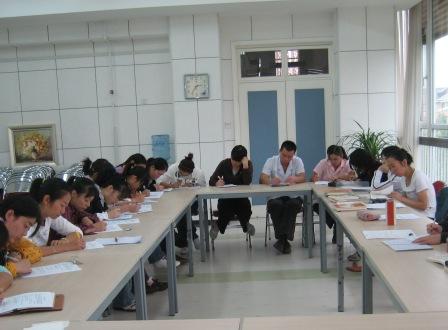 科研主任田瑞清老师在向大家介绍新配备的教师用书