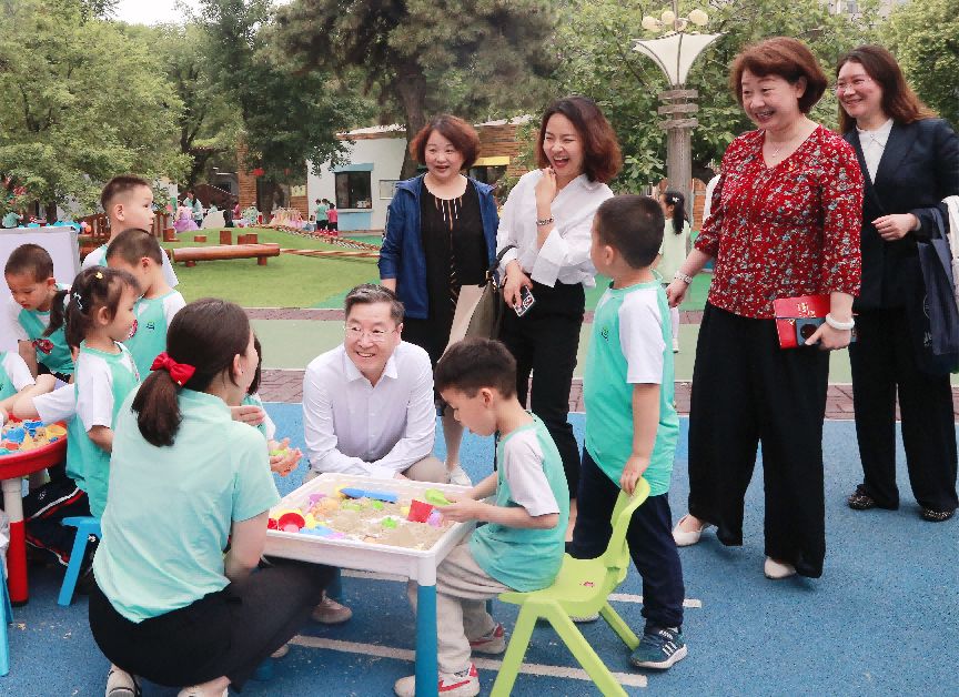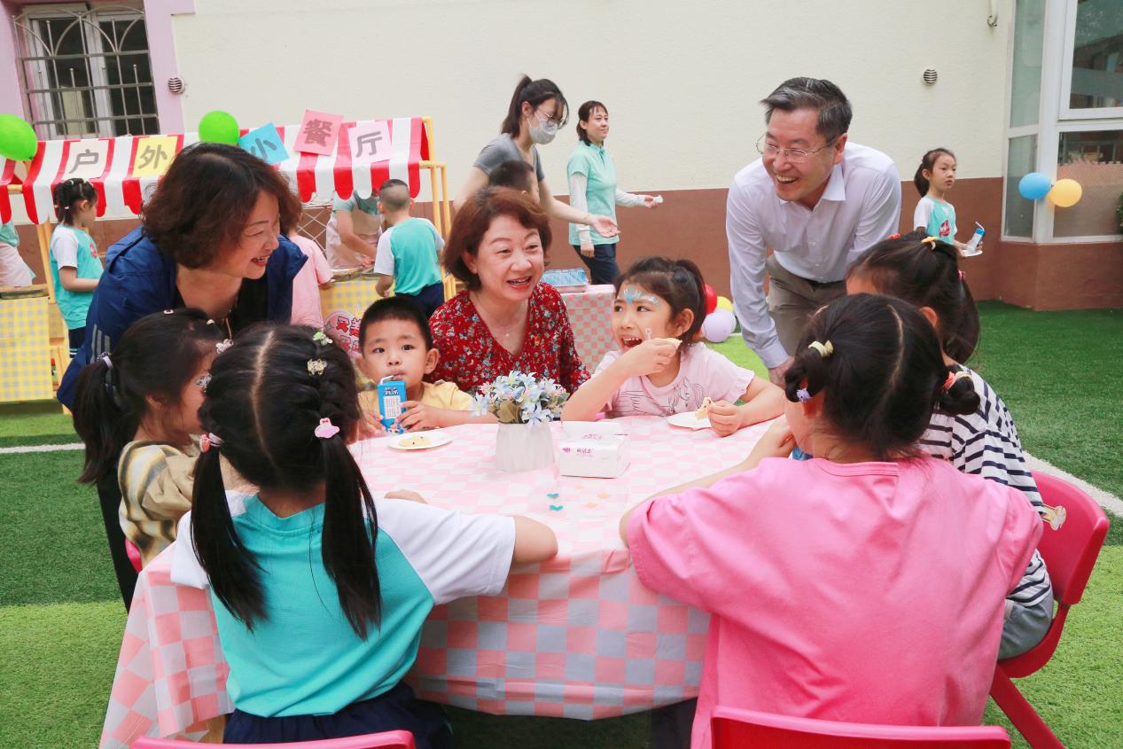 5月31日,学习贯彻习近平新时代中国特色社会主义思想主题教育九游体育第四指导组组长、九游体育副校长周作宇,指导组副组长徐洪,联络员吕寒菲来我园调研指导主题教育工作。恰逢园内举办“六一”游园会活动,周作宇副校长一行在实验幼儿园党总支书记兼总园长黄珊的陪同下参观了幼儿园并和教师、幼儿亲切互动。随后,黄珊书记就主题教育相关工作与指导组进行专题汇报交流。