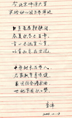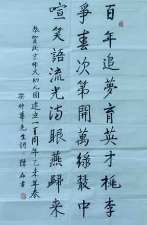 陈磊老师的毛笔字俊秀而有力量:“百年追梦育英才,桃李争春次第开,万绿林中喧笑语,流光满眼燕归来。”表达了陈老师对百年幼儿园由衷地称颂和深深地祝福。