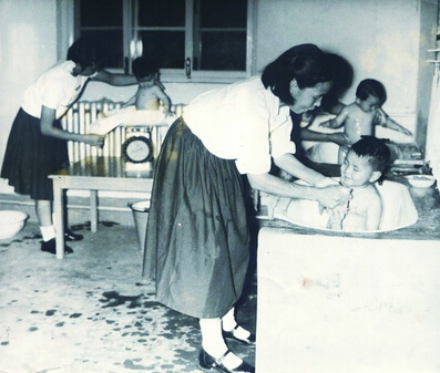 段裔老师年轻时在幼儿园为婴儿洗澡时的工作场景