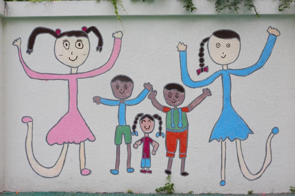 教师将幼儿对于“爱”的创作表达呈现于园所墙面环境