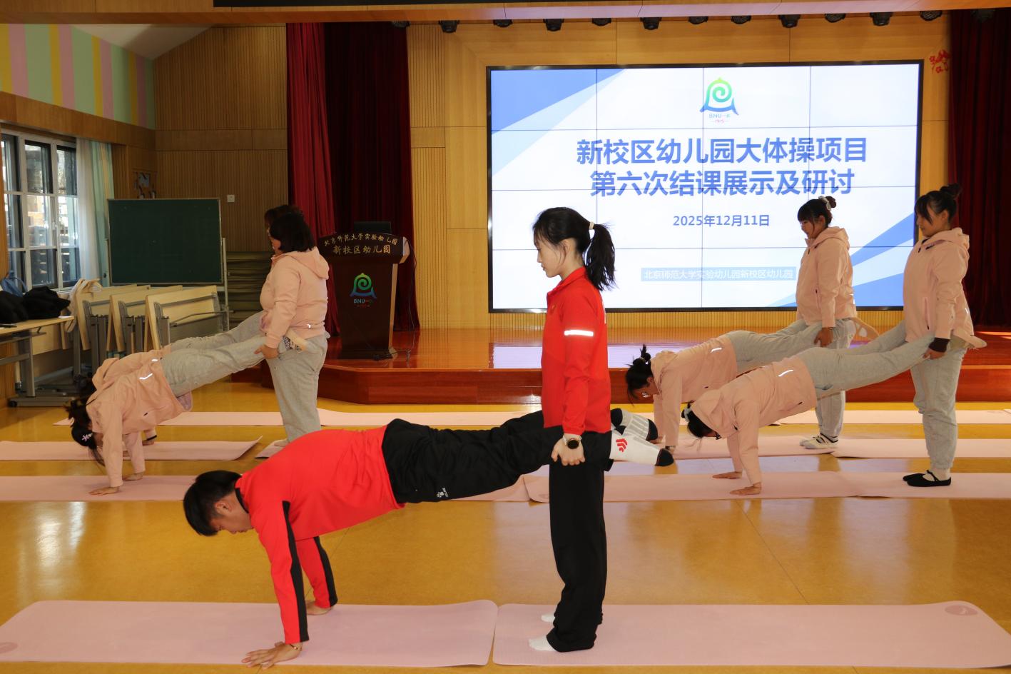 在点评交流环节,专家团队肯定了教师的阶段性成长,强调教师践行“言传身教”的必要性,建议大家在后续教学中主动发现并解决问题,持续精进专业能力,助力幼儿不仅在体操基本技能与体育精神塑造上有所收获,更能为幼升小衔接乃至未来专业训练筑牢基础。园方领导对专家团队的悉心指导表示诚挚感谢,明确后续工作核心为师资培训成果转化,全面启动教师向幼儿的转教工作。要求全体参训教师结合不同年龄段幼儿的身心特点,优化调整所学的体操技能与教学方法,下学期将幼儿大体操纳入日常教学活动,定期开展教学复盘,让幼儿在规范、有趣的体操活动中强健体魄、愉悦身心,推动幼儿大体操项目在园内常态化、高质量开展。